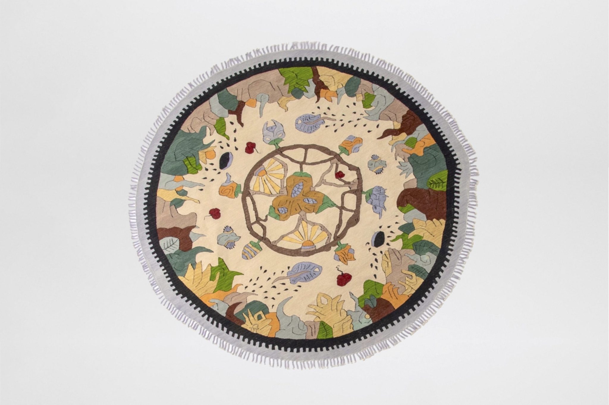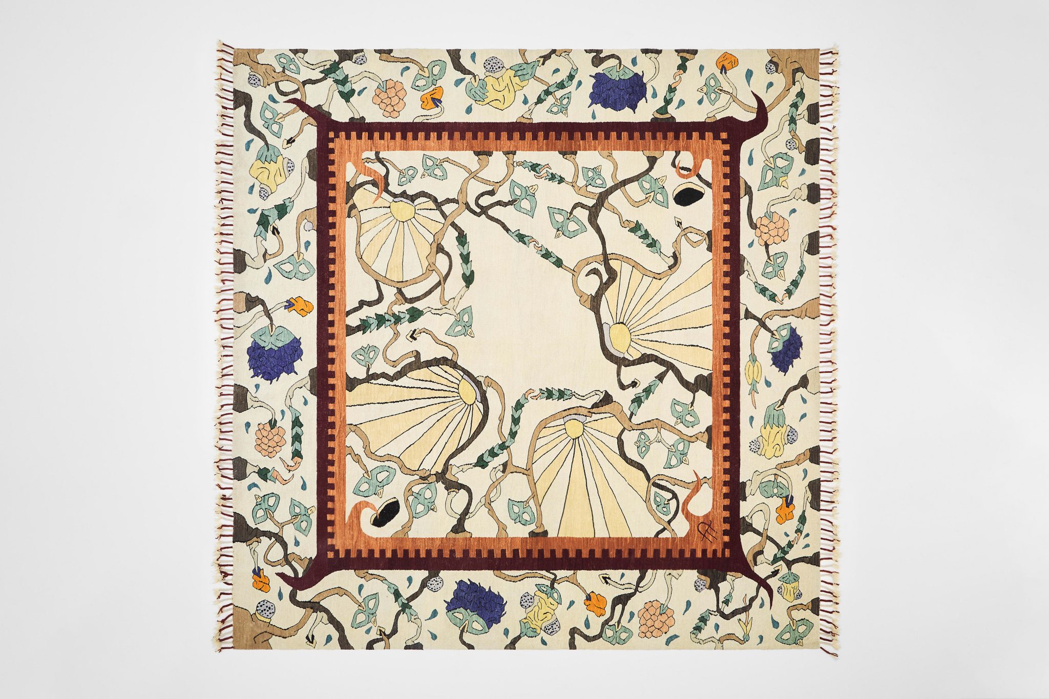 Drawing on the symbolic language of Kilim weaving — historically used to record nomadic experiences — his works become crafted archives of perseverance. Produced in collaboration with craftswomen across Anatolian villages in Türkiye, each piece is woven from locally sourced, naturally dyed wool, translating fictional botanics into coded compositions.