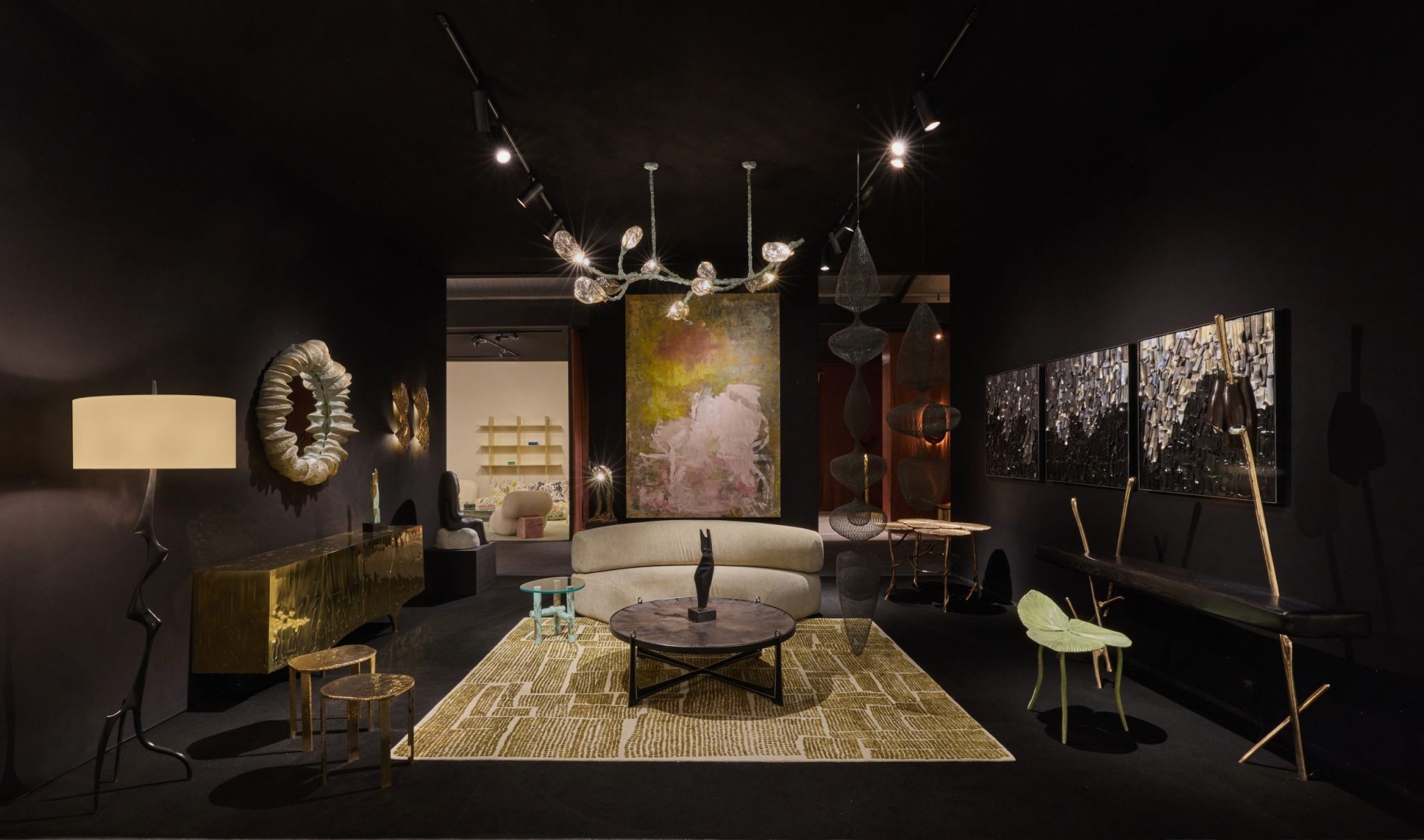 Conceived as an immersive scenography inspired by a contemporary interior, this presentation at PAD Paris 2026 explores the versatility of collectible design in shaping uniqueness and inspiring the creation of refined, visionary environments. Set against deep black walls, the booth creates a dramatic, almost theatrical atmosphere, in which each piece emerges with clarity and presence.