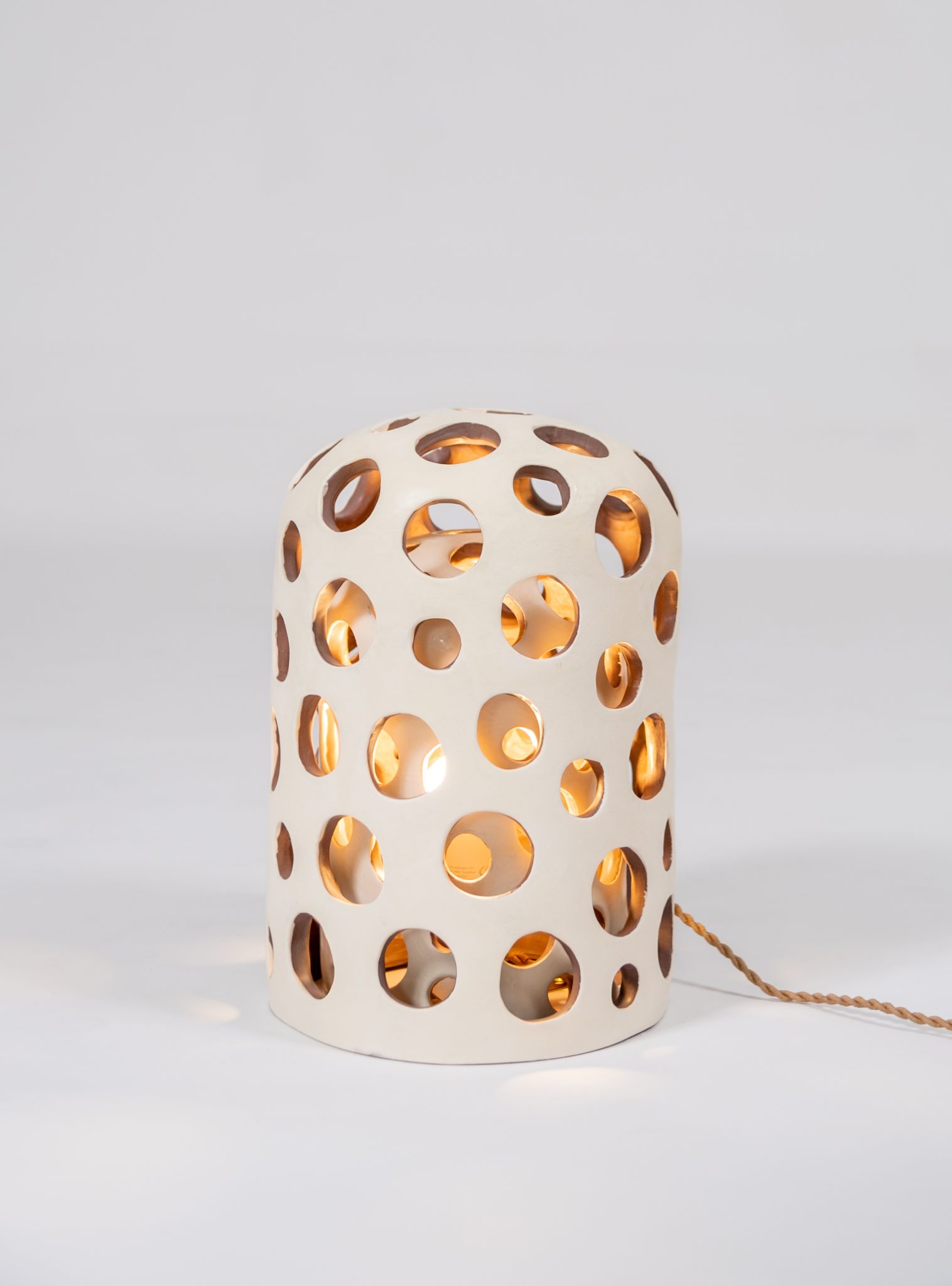 In these moulded forms, composed of two ceramic layers from hand-built pieces, the entire surface is meticulously carved by hand. Created as part of a limited-edition project, this research has led to the development of a new body of work comprising mirrors, table lamps, and sconces.
