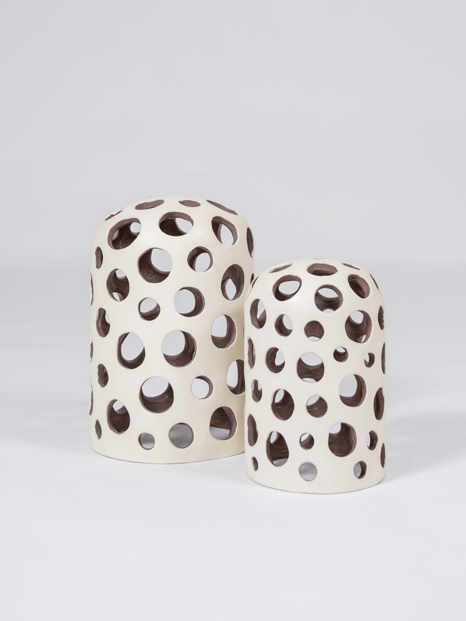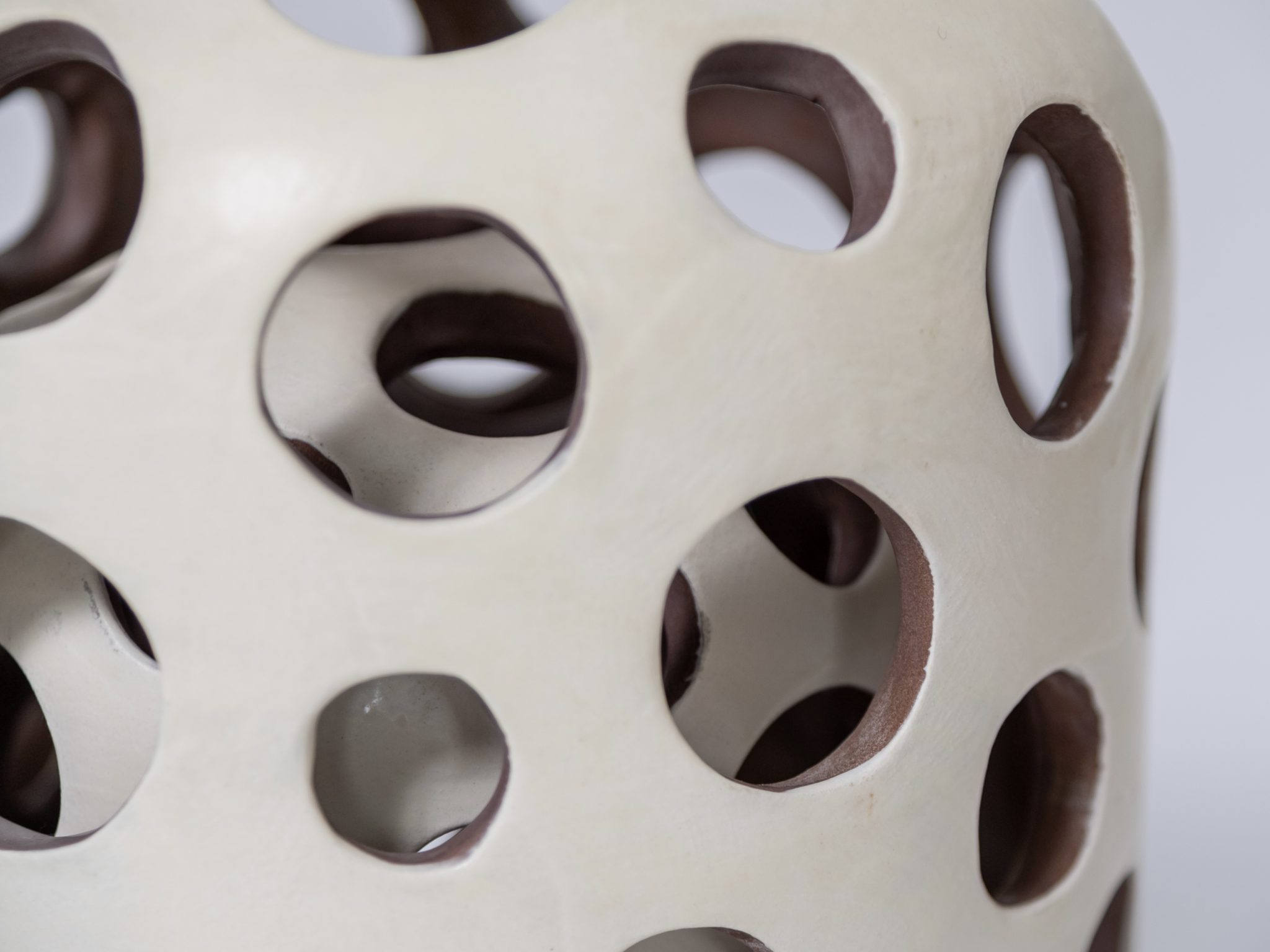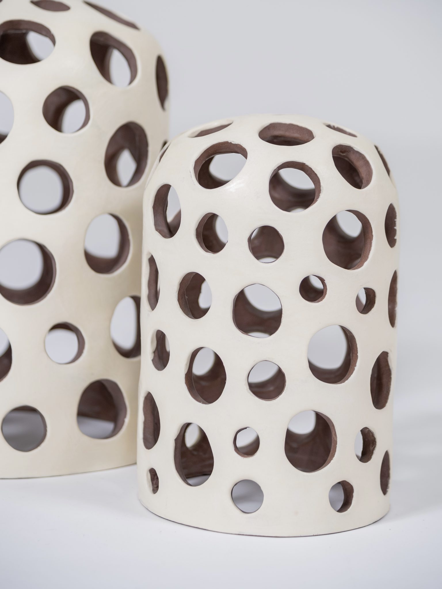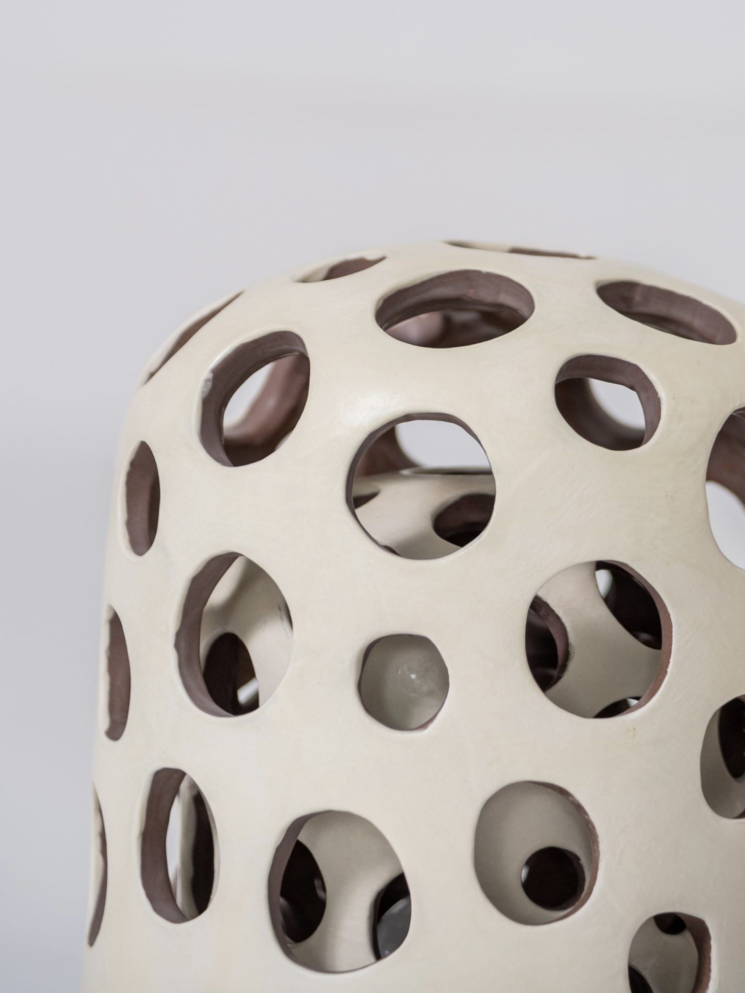 In these moulded forms, composed of two ceramic layers from hand-built pieces, the entire surface is meticulously carved by hand. Created as part of a limited-edition project, this research has led to the development of a new body of work comprising mirrors, table lamps, and sconces.
