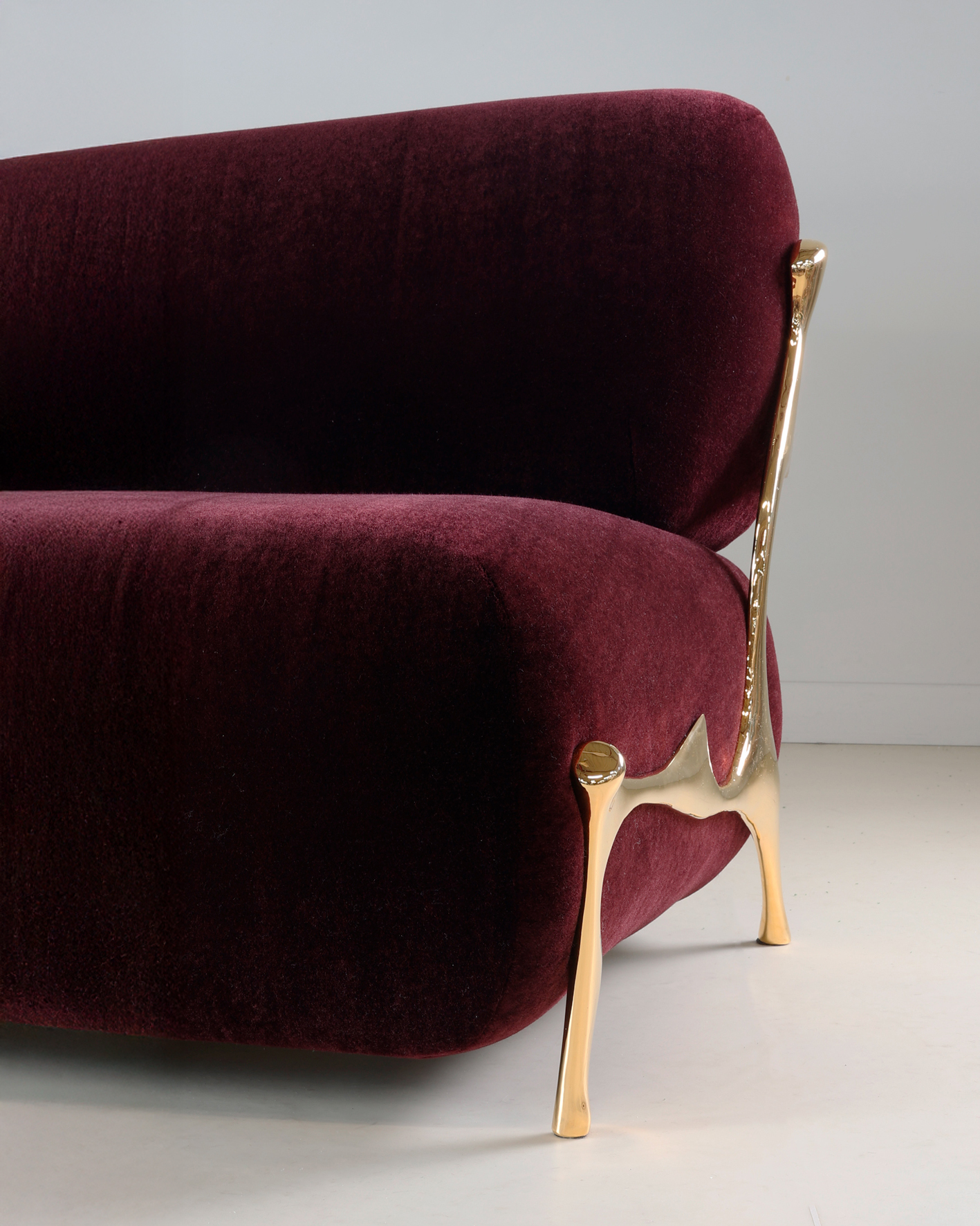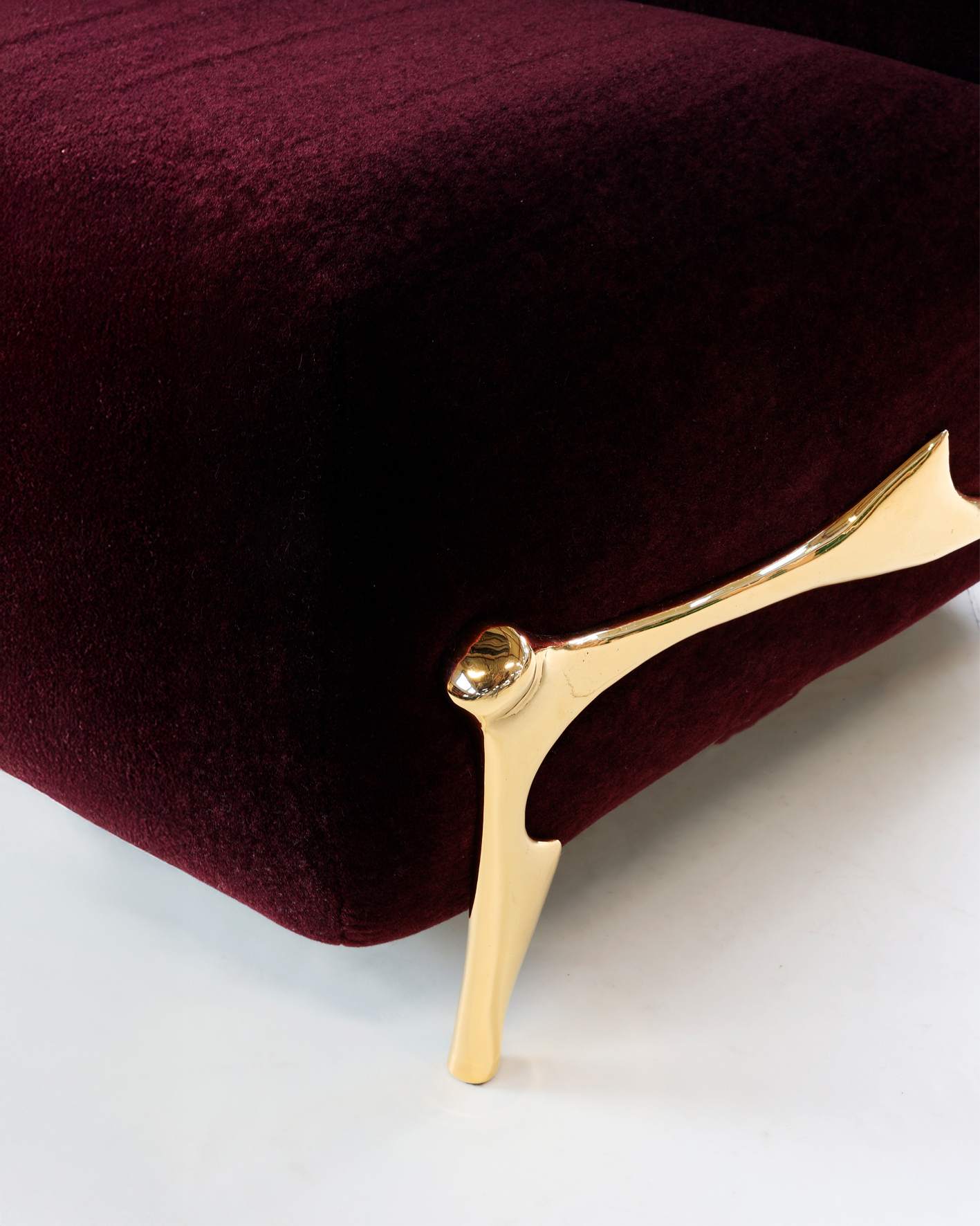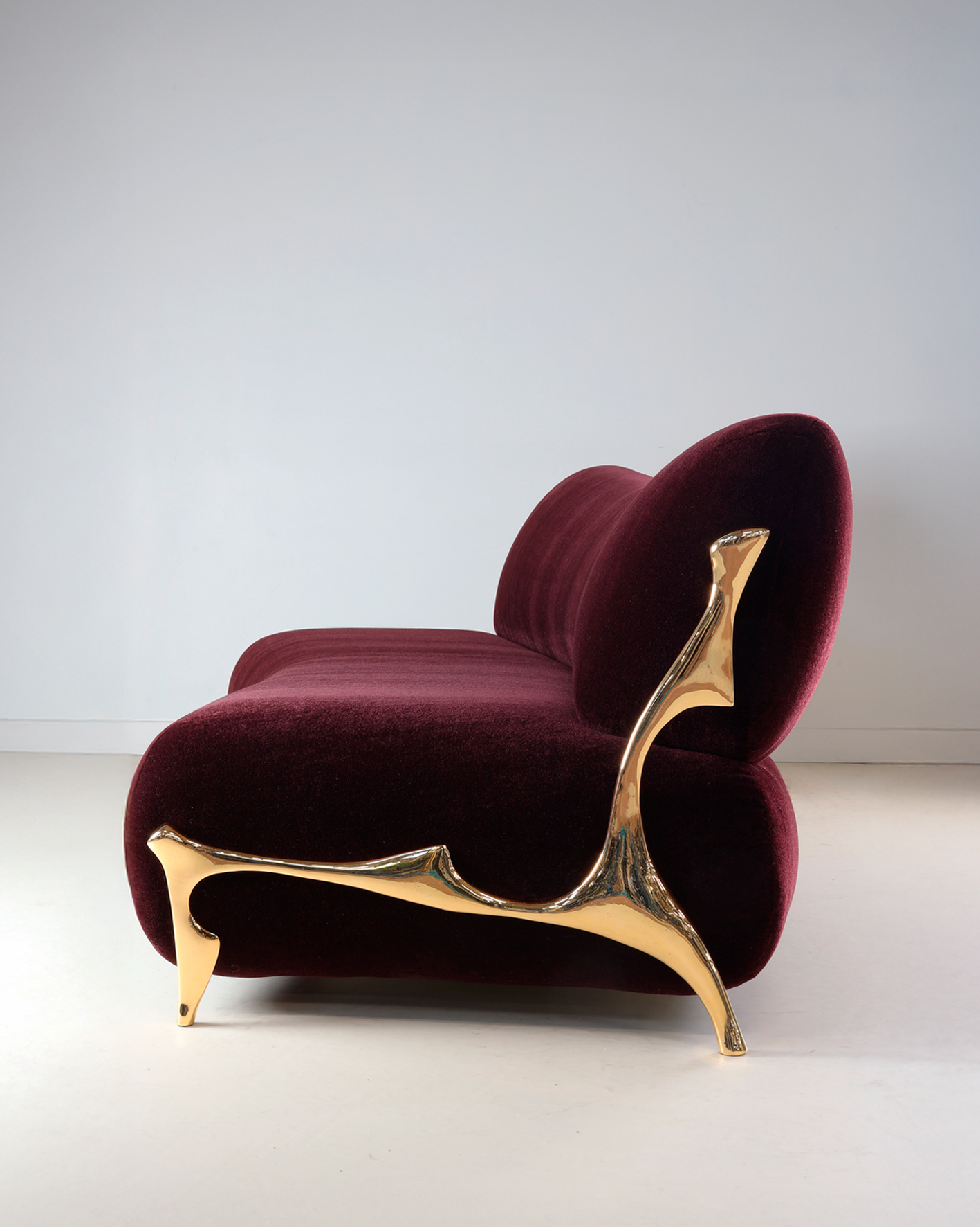 This piece, over two meters wide, combines their respective expertise: a base in 24-carat gold-plated bronze and a seat in mohair velvet.