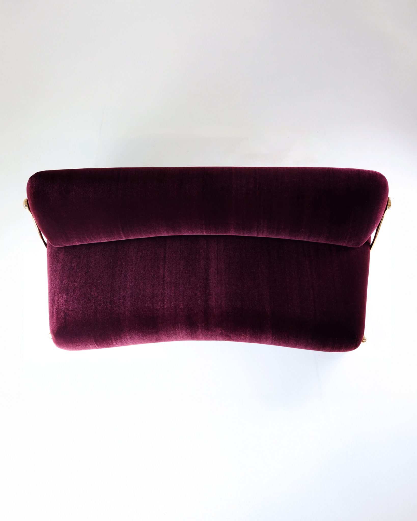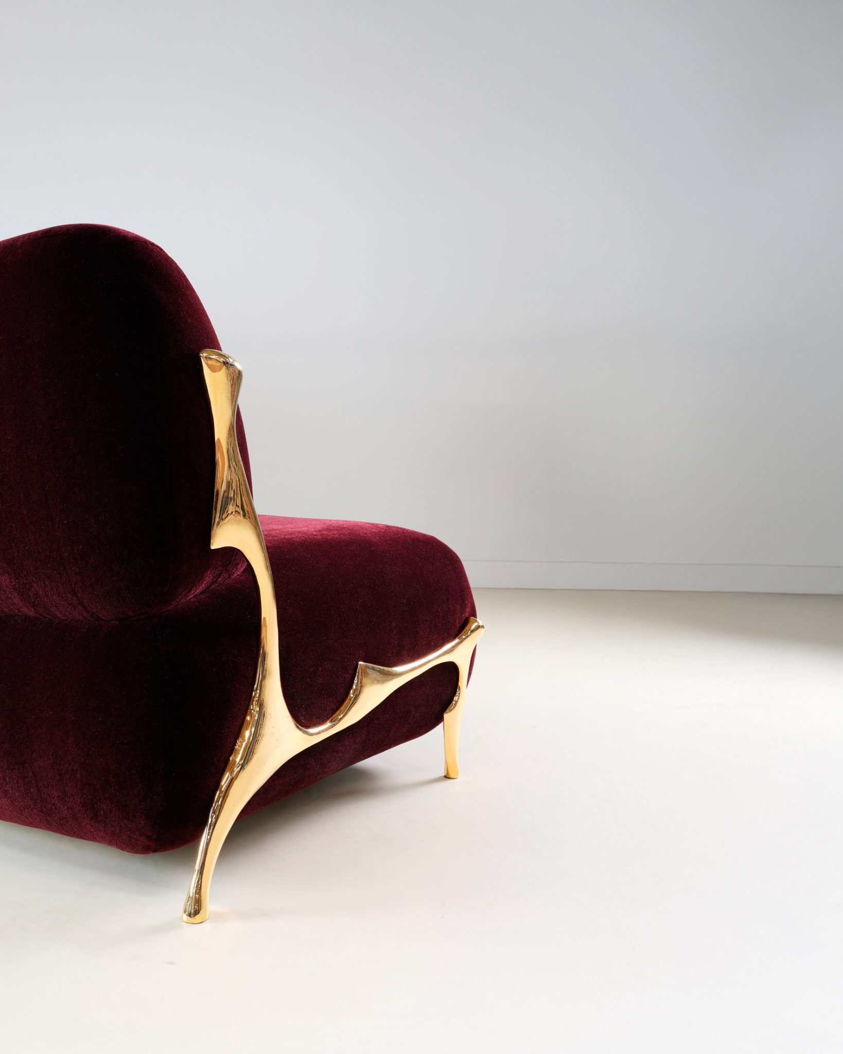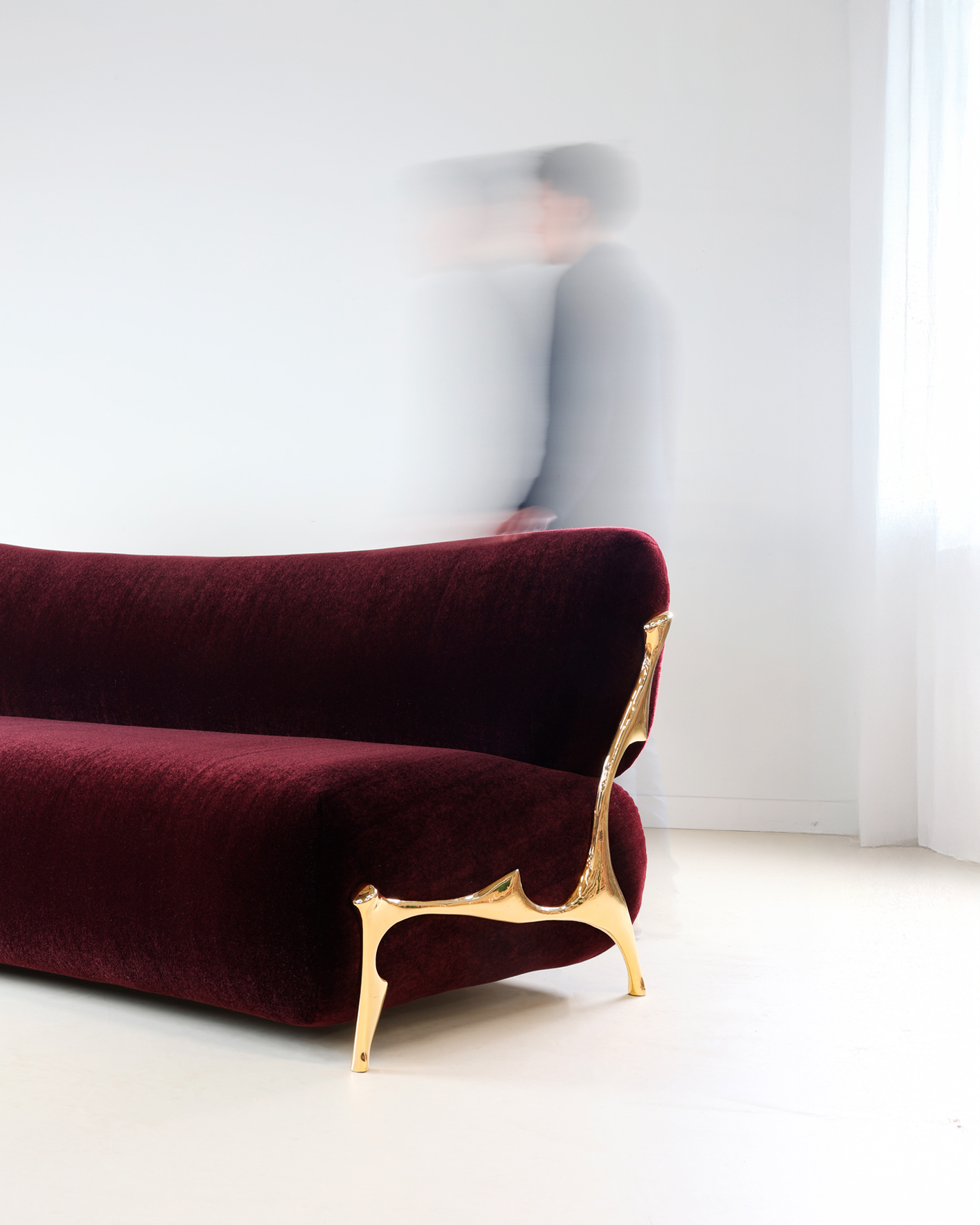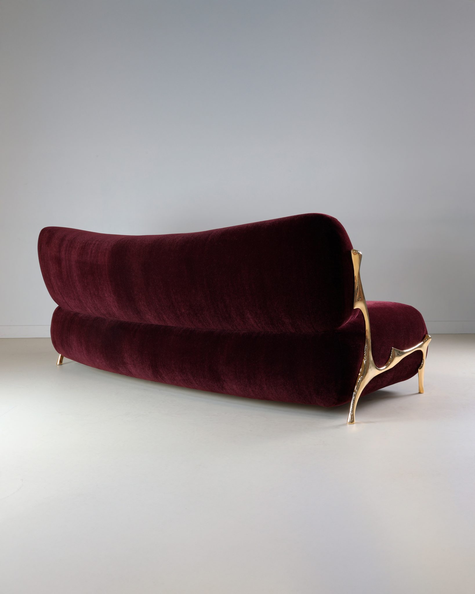 This piece, over two meters wide, combines their respective expertise: a base in 24-carat gold-plated bronze and a seat in mohair velvet.