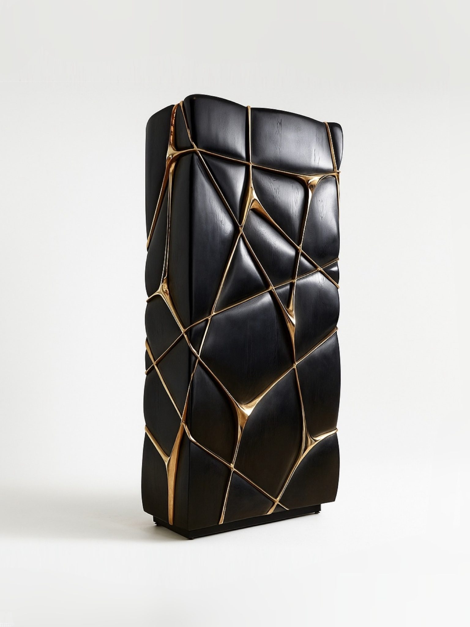 More than a functional storage piece, the ‘Neurone’ Cabinet stands as an architectural sculpture. Crafted from blackened oak and polished bronze, the piece evokes the complex, branching structures of a neural network. The surface is an intricate composition of irregular, interlocking panels, each edged with gleaming lines that seem to pulse with energy.