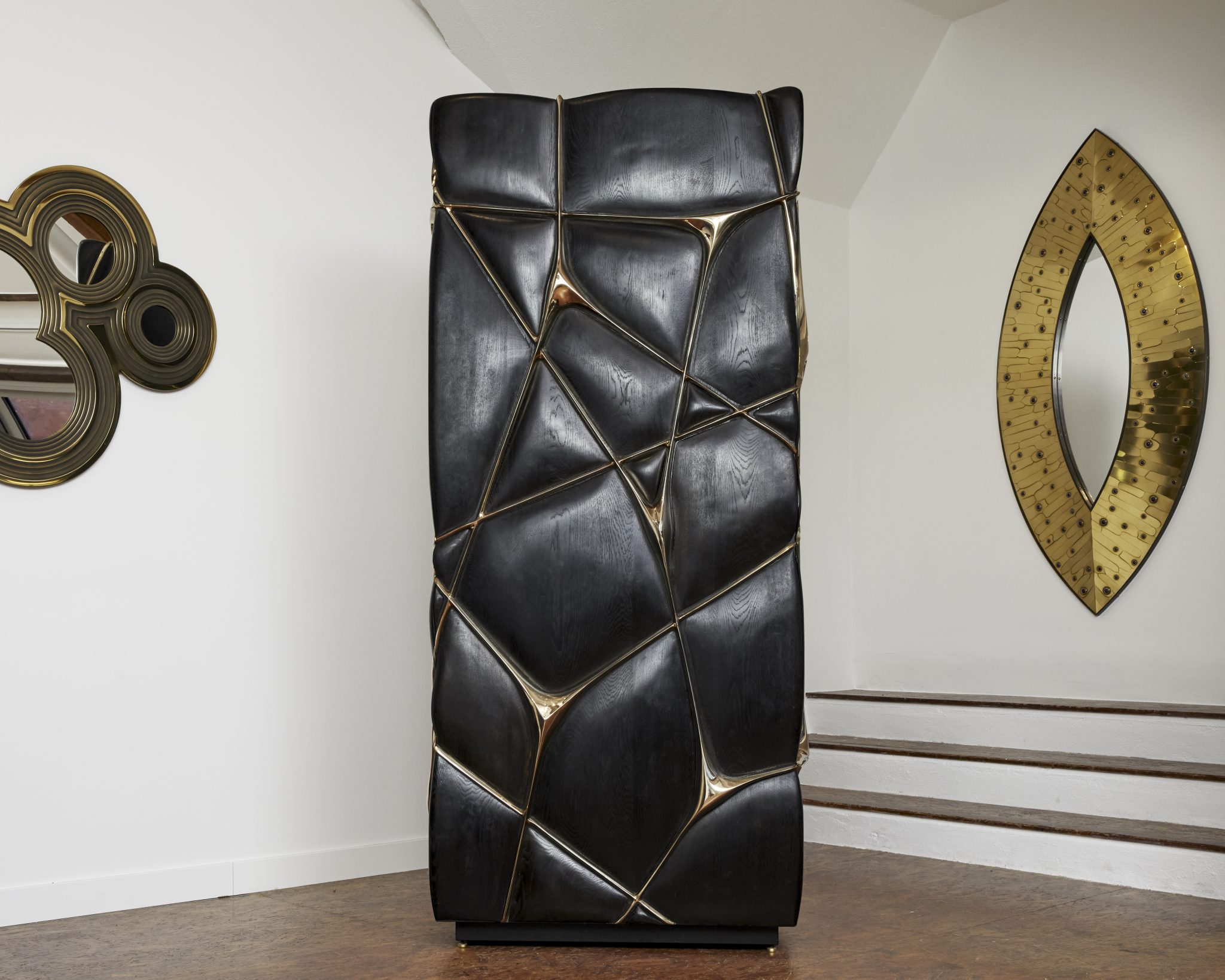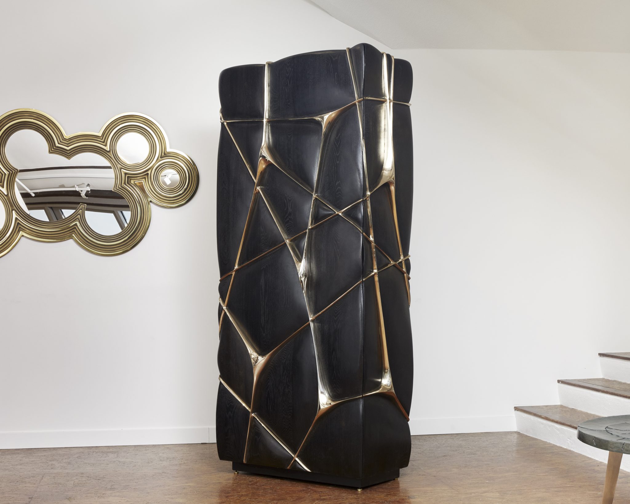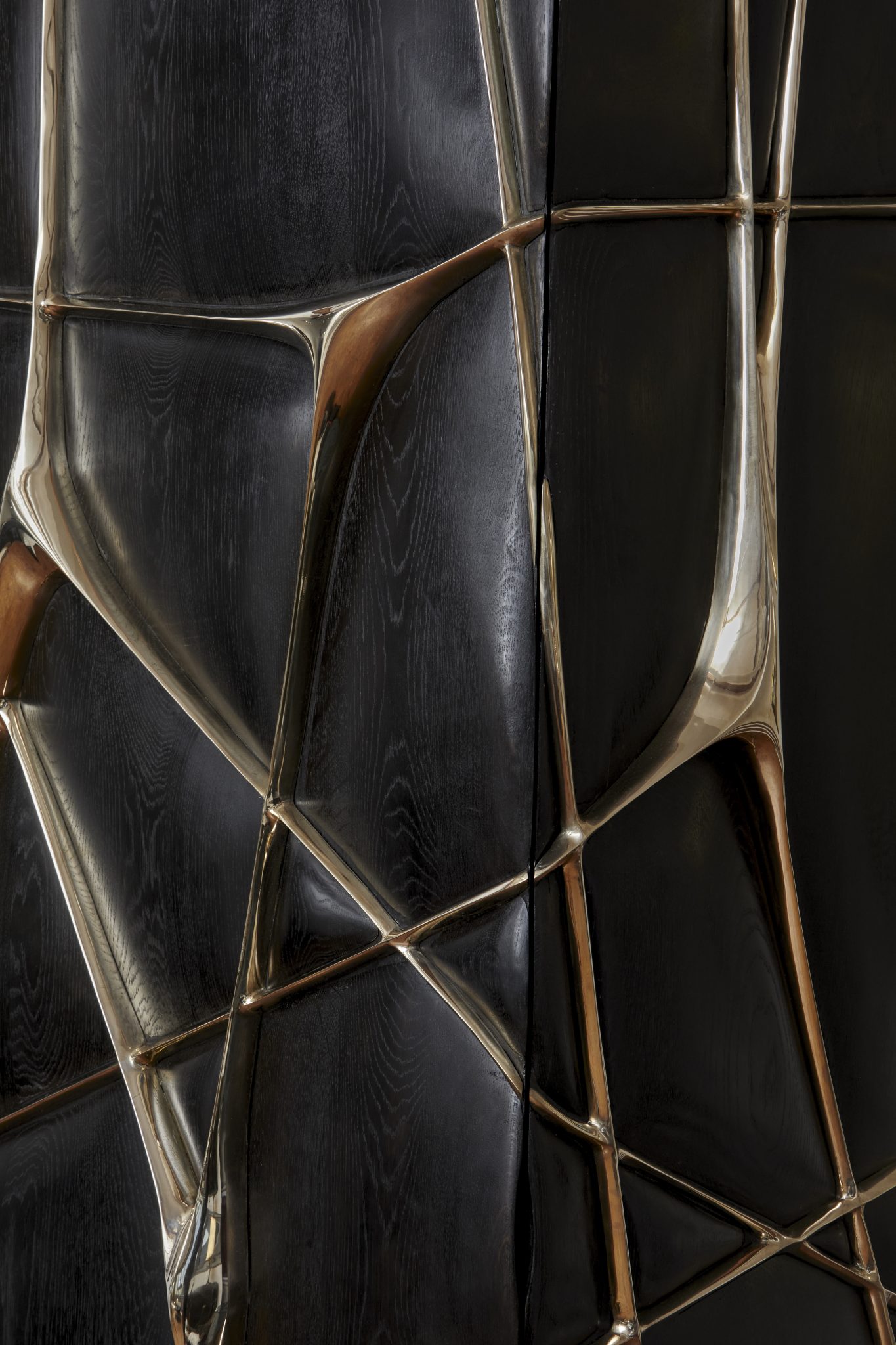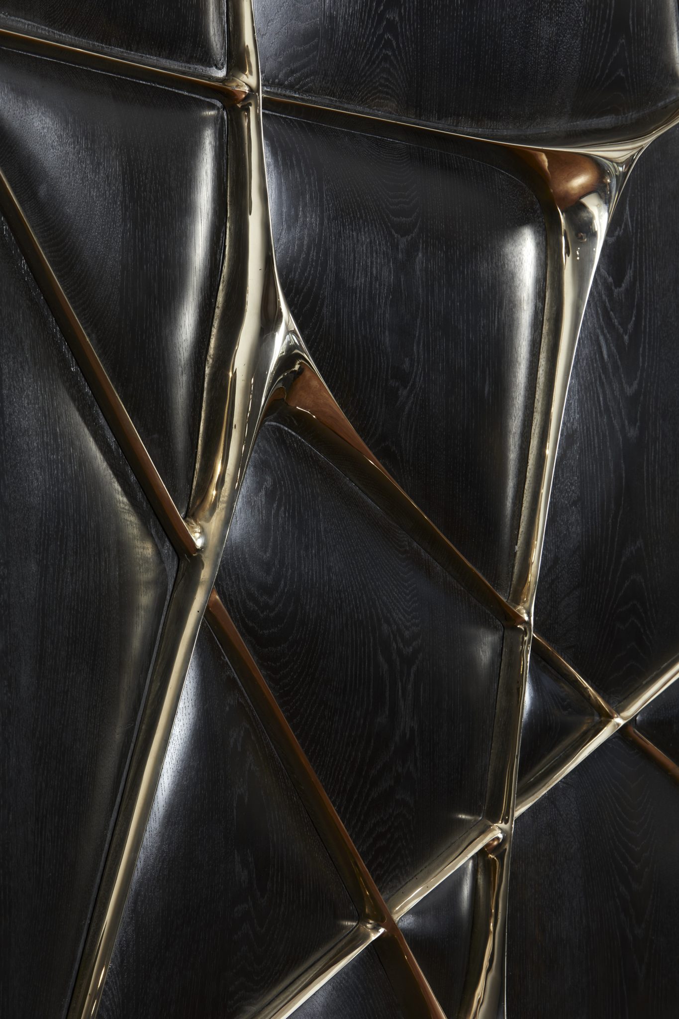 More than a functional storage piece, the ‘Neurone’ Cabinet stands as an architectural sculpture. Crafted from blackened oak and polished bronze, the piece evokes the complex, branching structures of a neural network. The surface is an intricate composition of irregular, interlocking panels, each edged with gleaming lines that seem to pulse with energy.