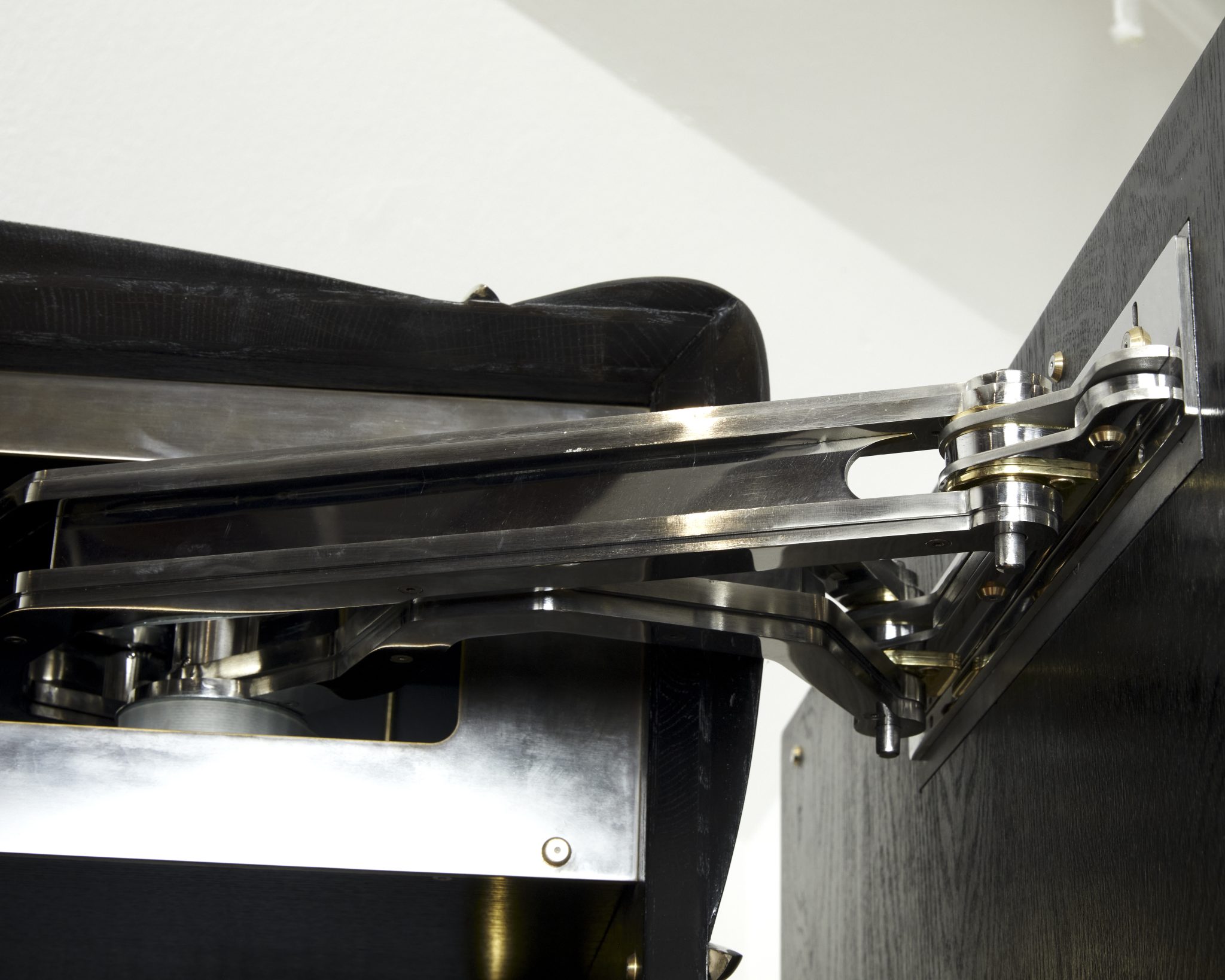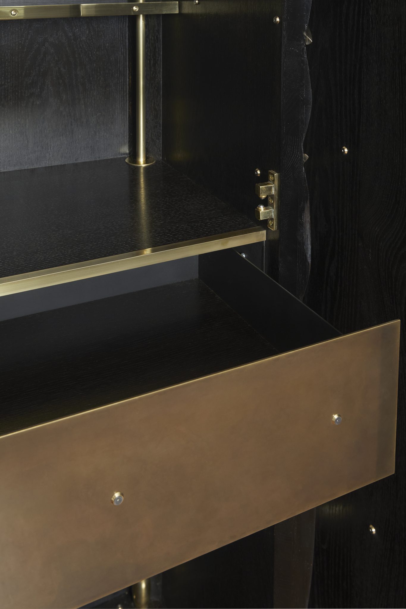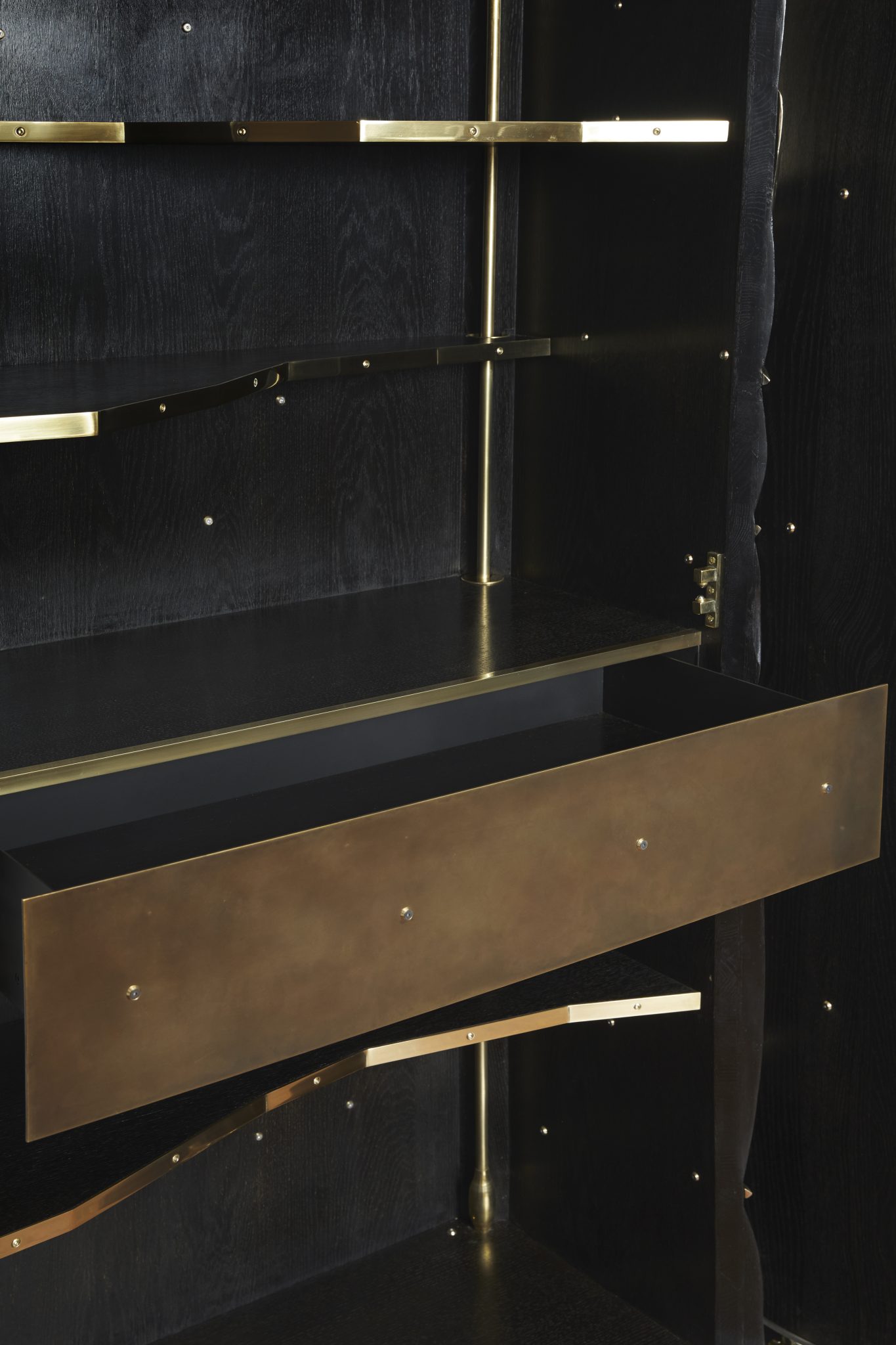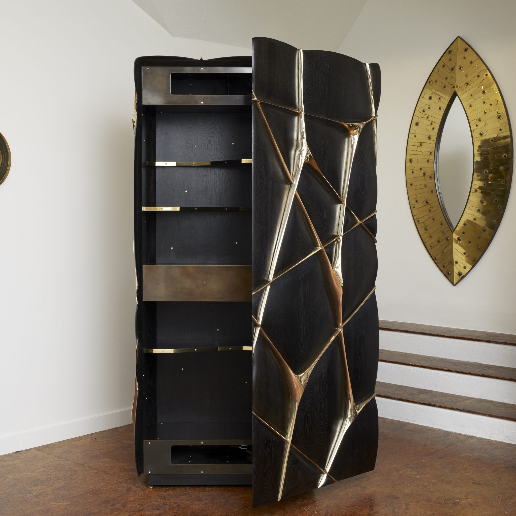 More than a functional storage piece, the ‘Neurone’ Cabinet stands as an architectural sculpture. Crafted from blackened oak and polished bronze, the piece evokes the complex, branching structures of a neural network. The surface is an intricate composition of irregular, interlocking panels, each edged with gleaming lines that seem to pulse with energy.