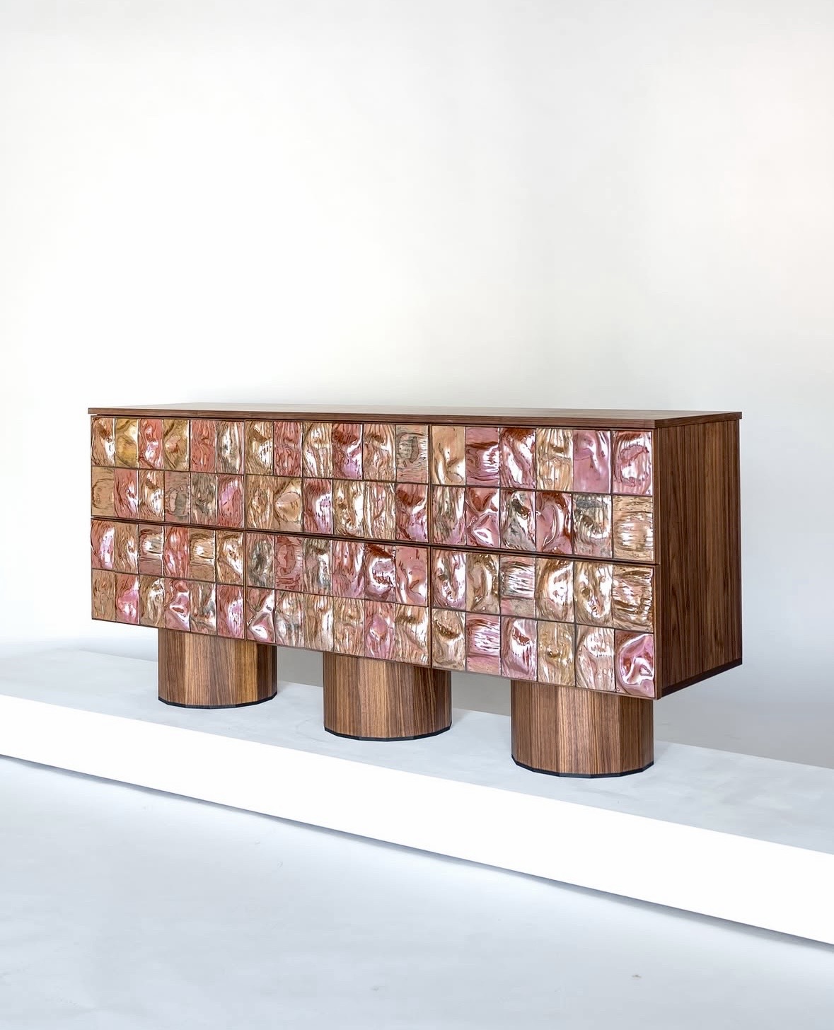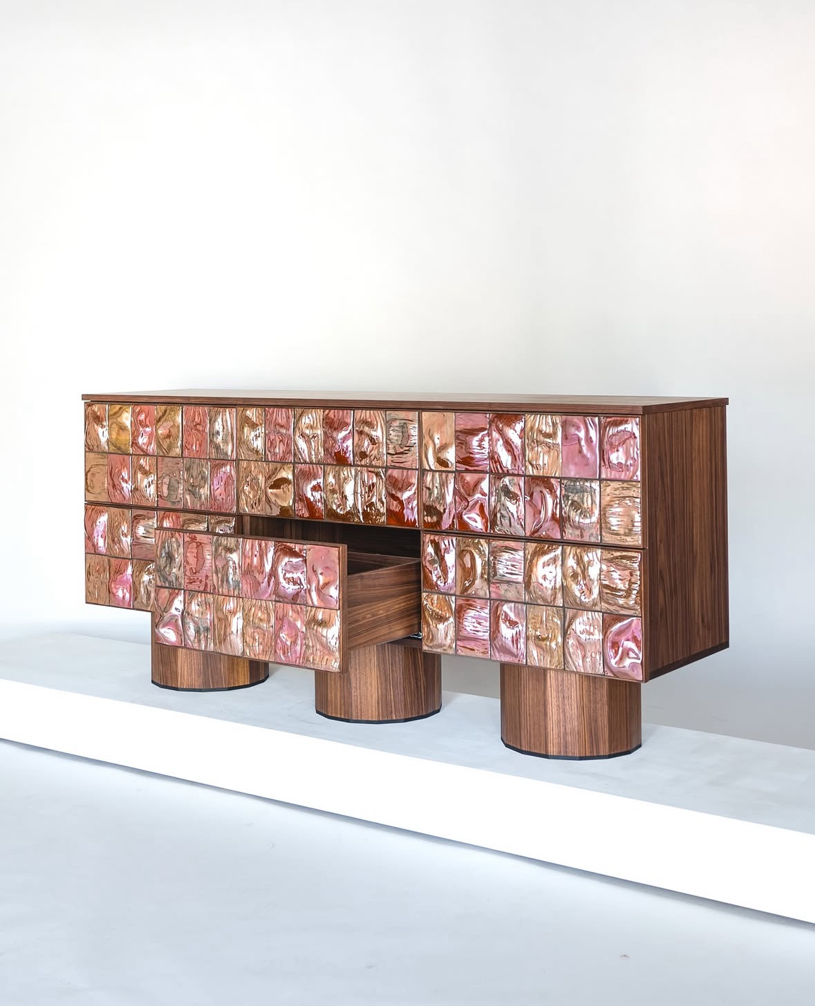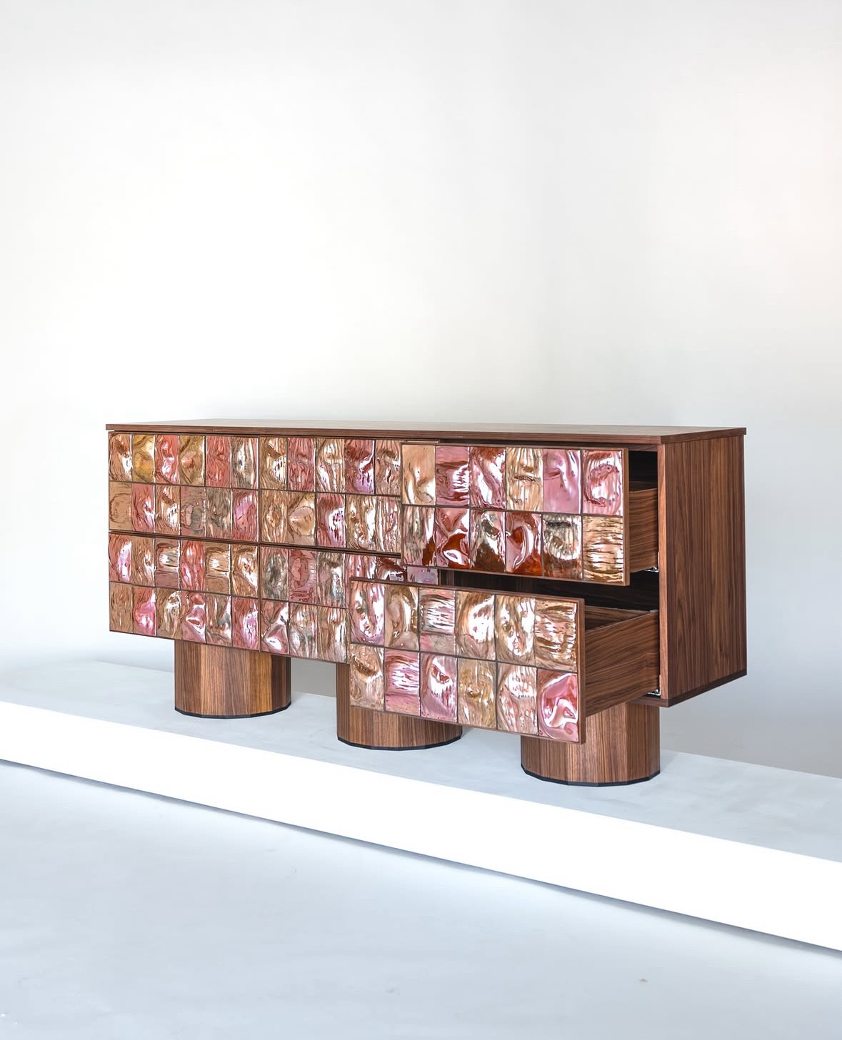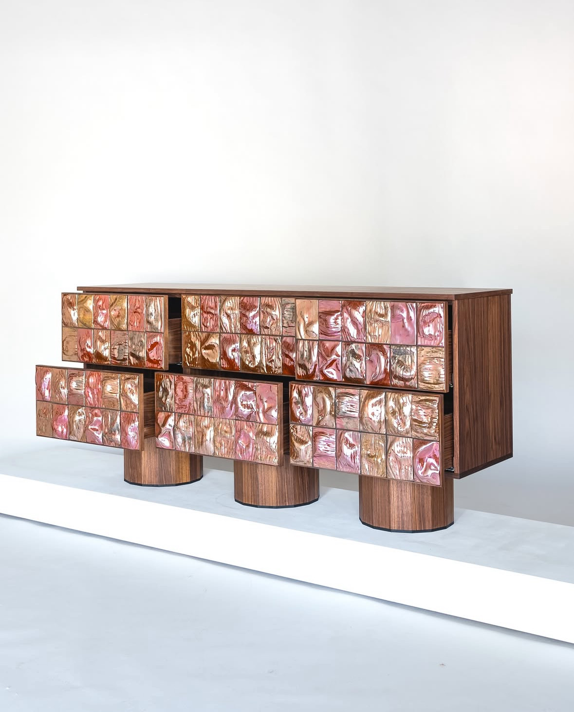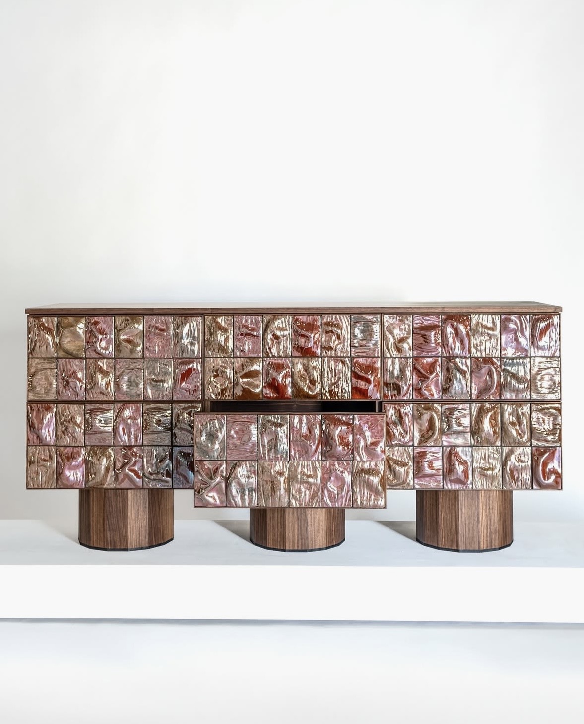 Ceramic tiles shape the front surface of the piece, while the body is crafted from wood.